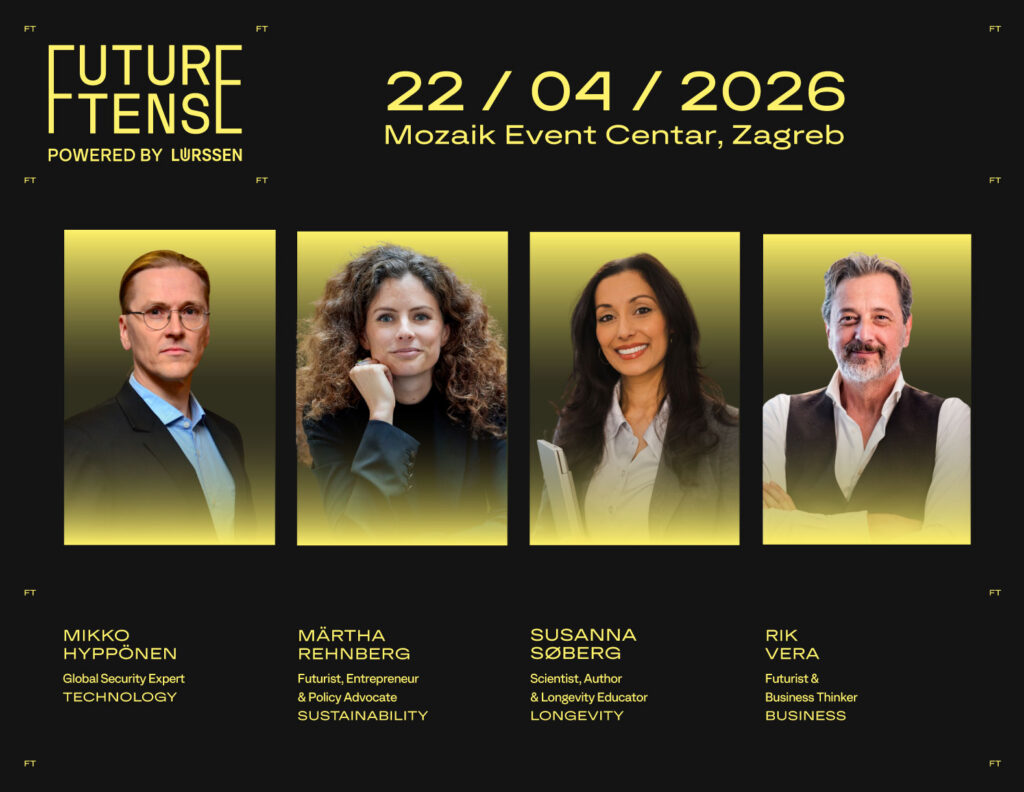 Future Tense powered by Lürssen okuplja vodeće poslovne lidere, predstavnike akademske i znanstvene zajednice, a suradnjom s Kopenhaškim institutom za studije o budućnosti (CIFS), IEDC Poslovnom školom Bled, Udrugom za promociju pametnih industrija te Europskim forumom potiče razvoj nove generacije lidera spremnih na buduće izazove.